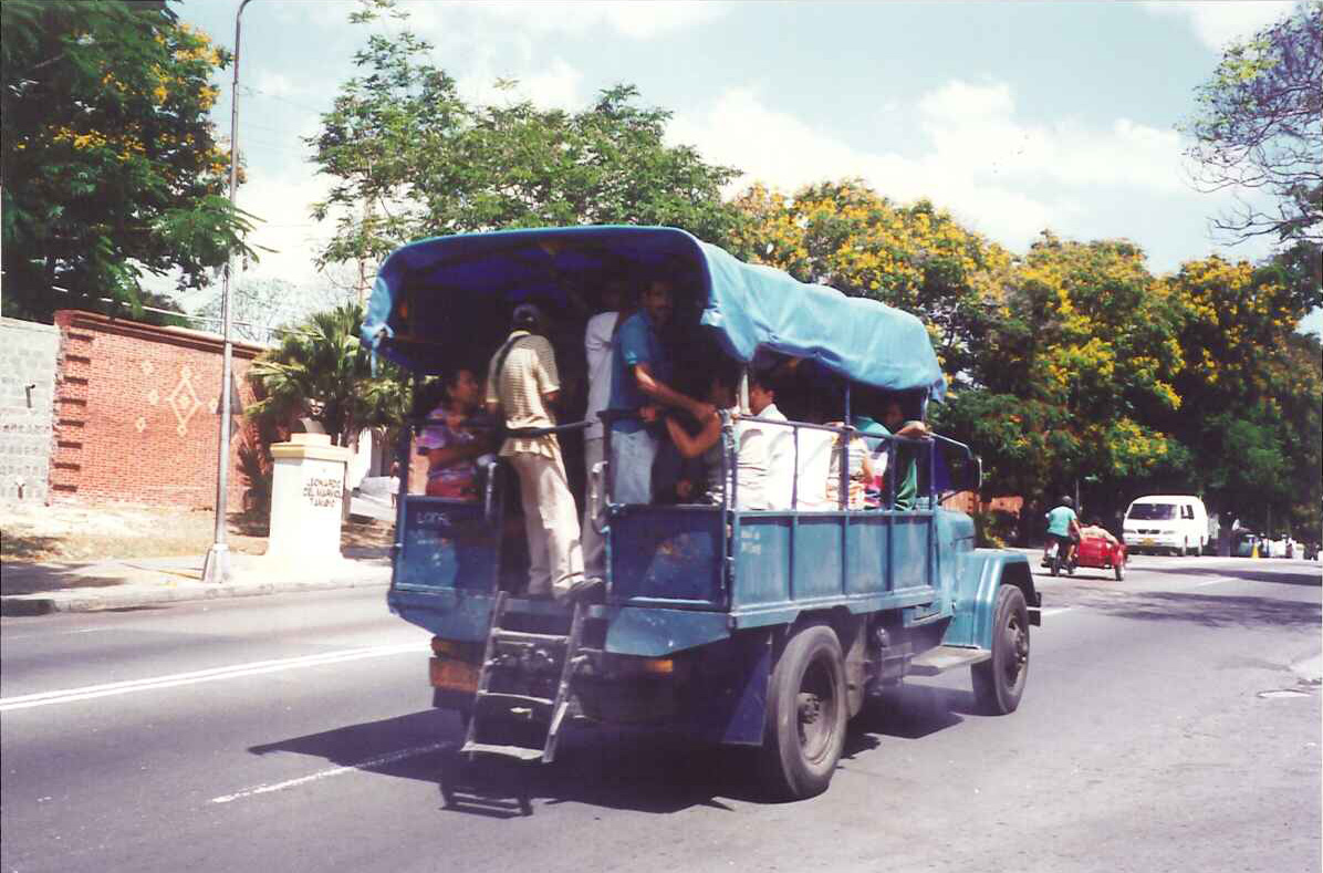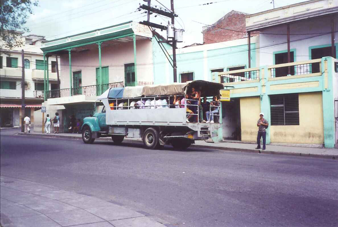 Os Ônibus mais “modernos “foram importados do Brasil (passagem 20 centavos de peso). O Camelo é outro tipo de ônibus, com uma corcova puxado por caminhão (1 centavo de peso). Taxi particular– o proprietário leva passageiros – é mais utilizado pelo cubano (10 pesos por pessoa). Taxi comum– com taximetro, (1 dólar a bandeirada), que muda a cada km. Bicicleta – leva 2 passageiros, o Caminhão- com carroceria e uma escada na parte de trás para o passageiro subir e o Taxi coco -lambreta com uma cobertura que lembra o coco, leva dois passageiros.
