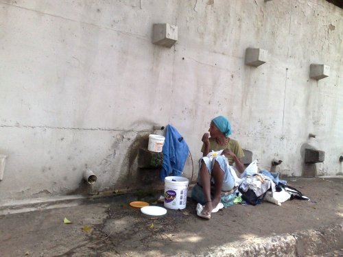 Mulher utilizando água que jorra através de um cano, na busca de "atender suas necessidades". Colônia da Glória- São Paulo
