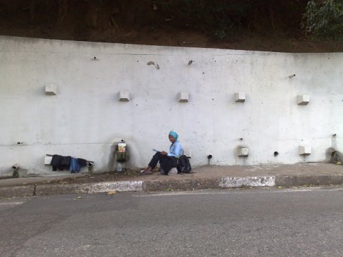 Mulher que encontra na cobertura do ponto de ônibus e no sofá abandonado, a busca de "seu aconchego". Av. Lins de Vasconcelos- V. Mariana- São Paulo